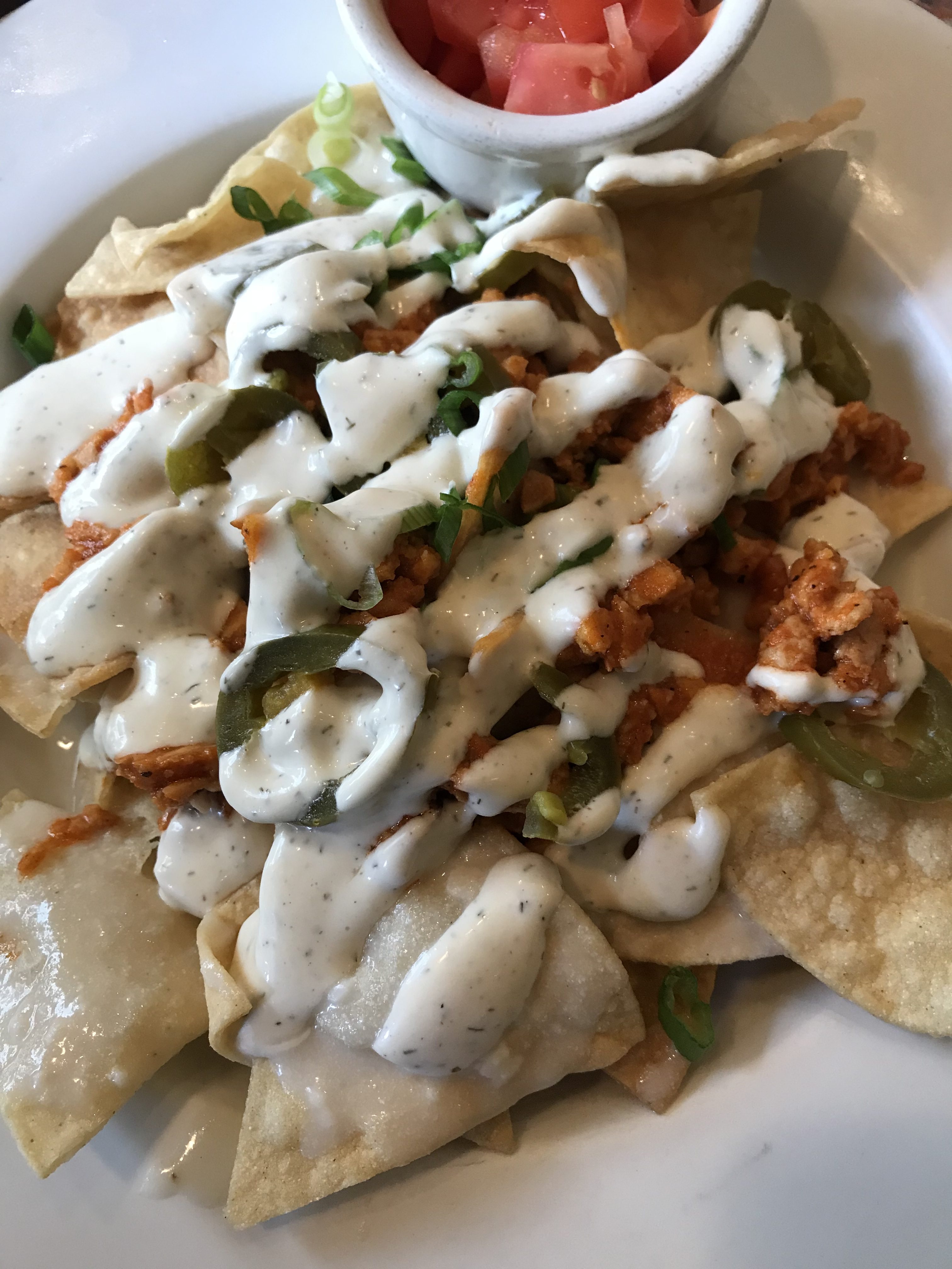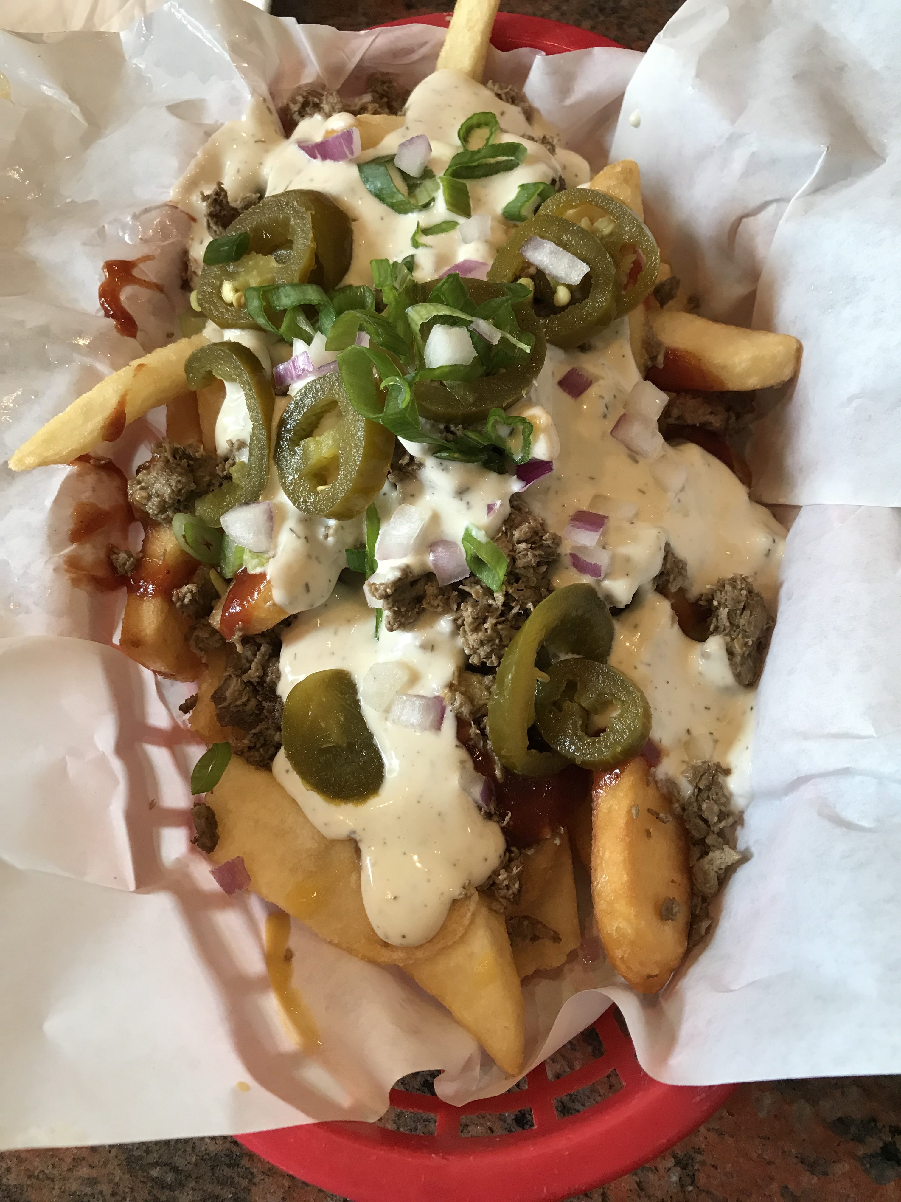 We decided to stay and grab a bite to eat as we were in for a big surprise with the vegan options at Cybelle’s. I had the nachos, Saundra had the loaded fries, and Robyn had the caesar salad.