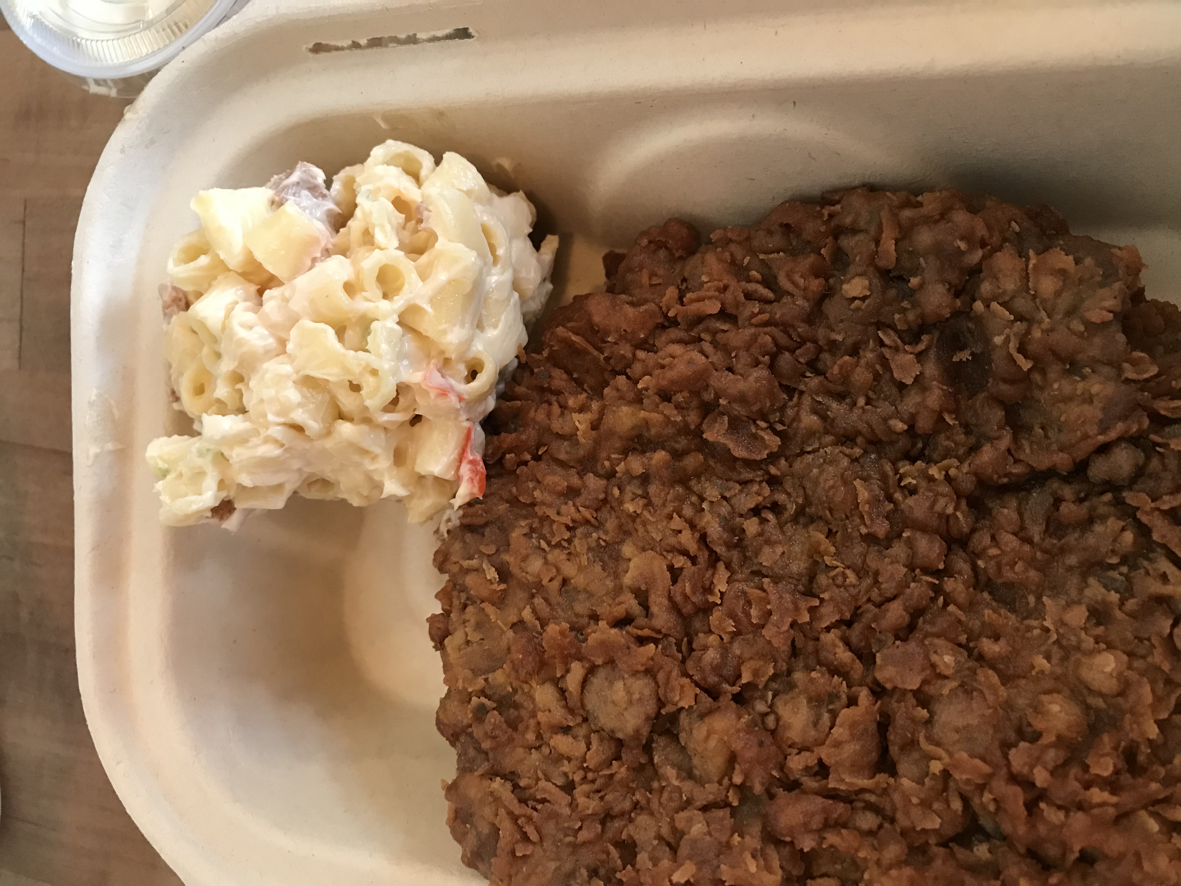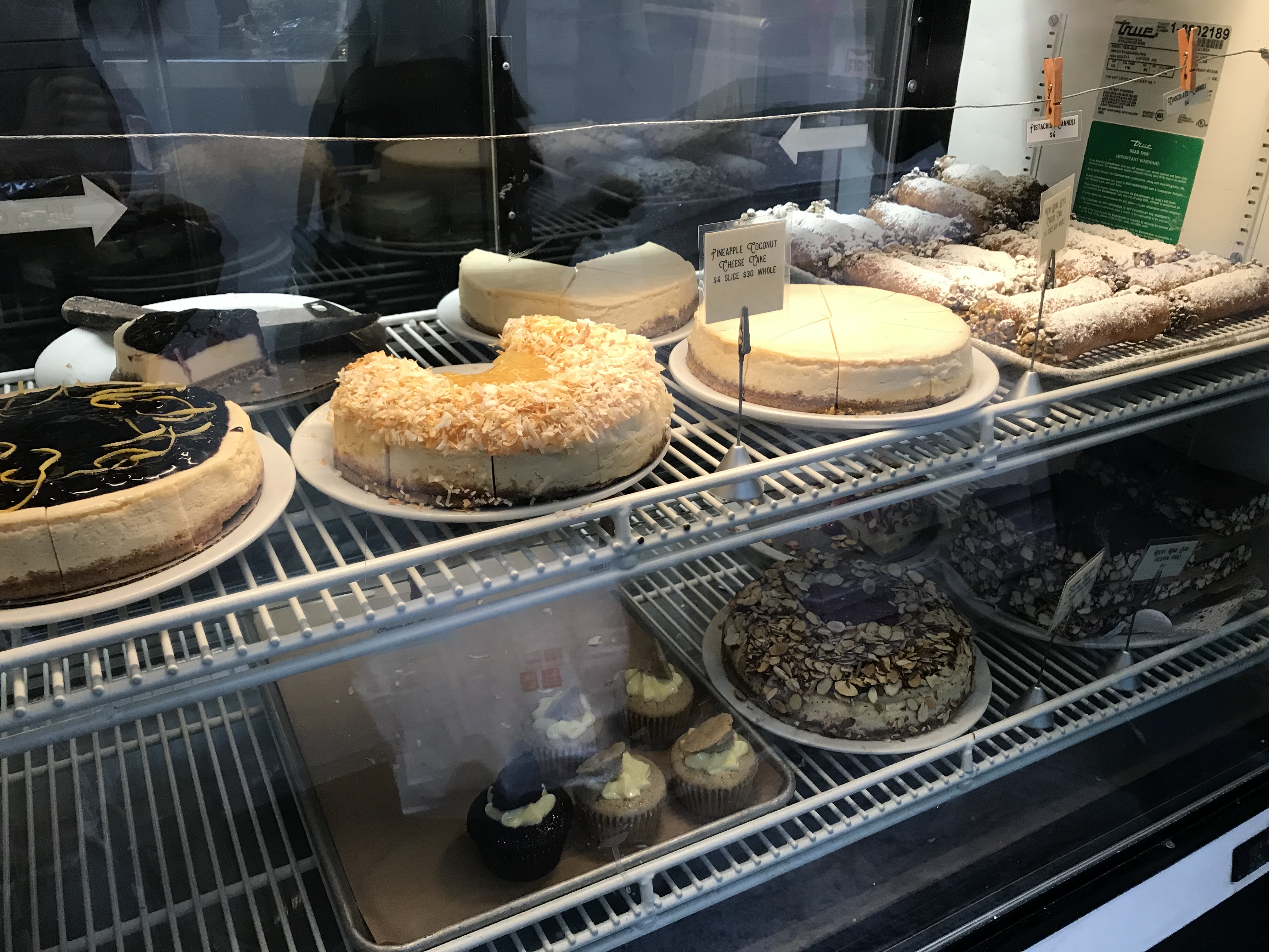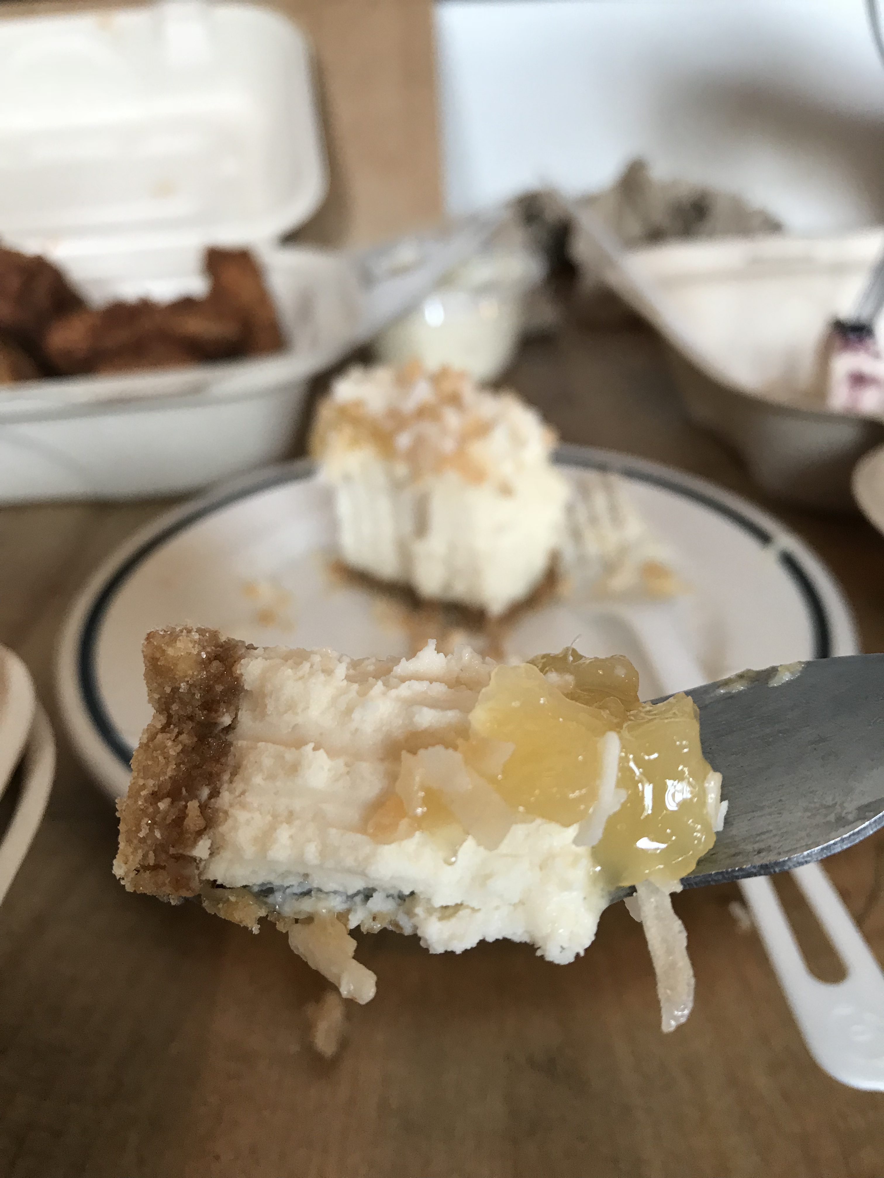 I had a hard time selecting something, but when I saw the cheesecake in the deli case, I knew I had to have it. Now mind you, we just ate at Cybelle’s so we are still a little full, but we have to get something for the good of all junk/comfort food vegan eaters out there. I decided to keep it simple and order a side of the macaroni salad with bacon, a piece of the fried chicken, and the pineapple upside down cheesecake. The chicken had a nice crunch and adding some hot sauce gave it the just the right amount of flavor. The macaroni salad was good with the bacon adding a little smoky flavor. Now the the cheesecake was O to the M G delicious!!! It was nice and creamy with the perfect amount of richness. It was so good that we now have a new convert who did not like cheesecake or anything cheesy to someone who now likes this cheesecake.